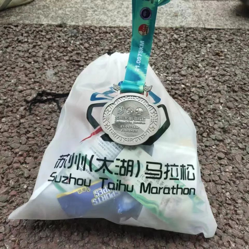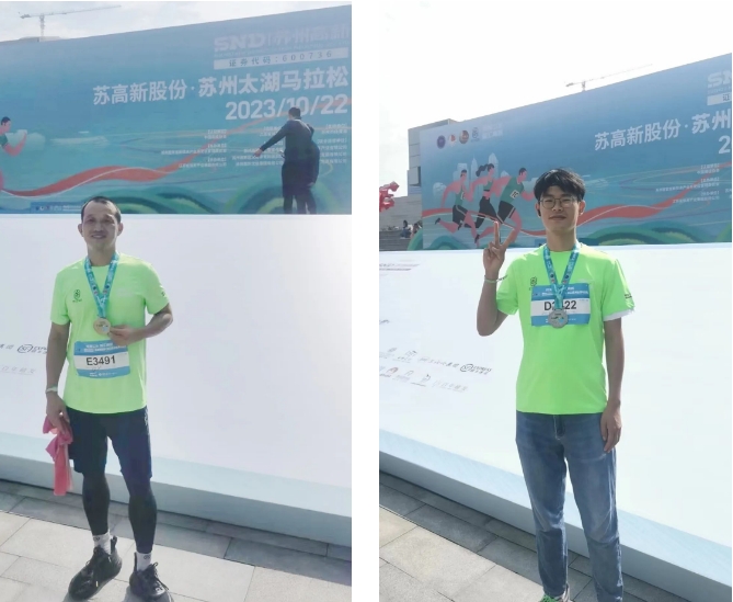 參加半馬的兩位員工到達(dá)終點(diǎn),獲得獎牌